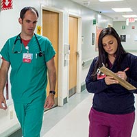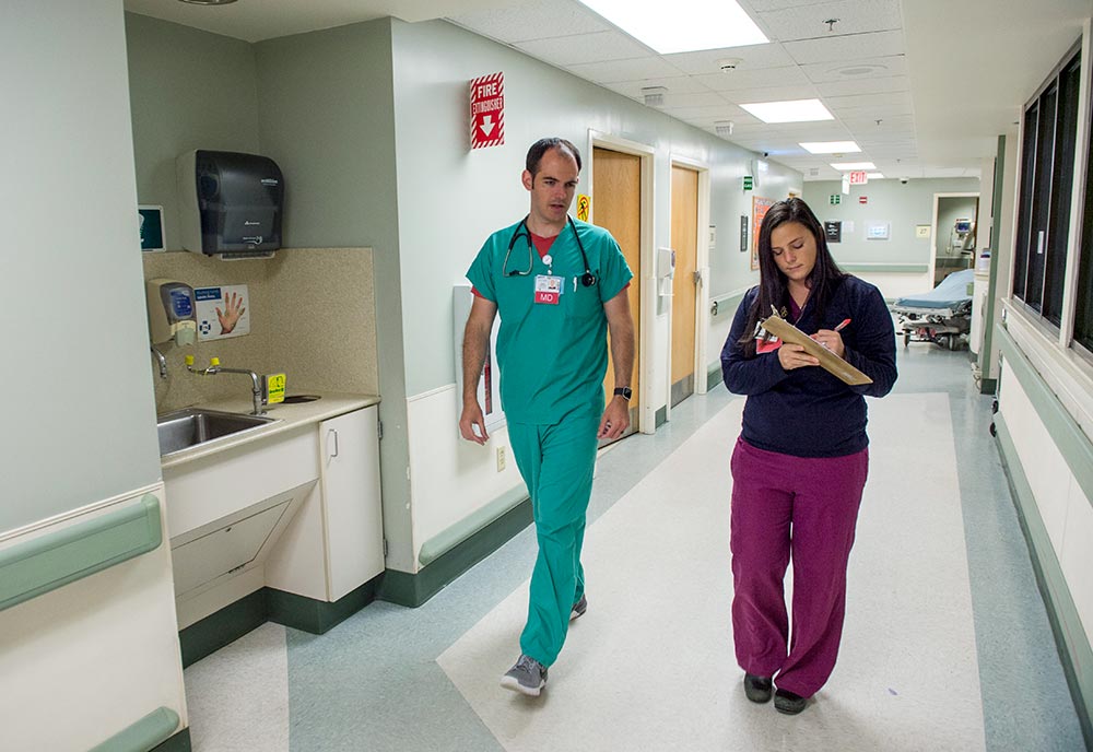 Dr. Allen talks through his medical findings with scribe Delanie Edwards as they walk from one patient room to another.