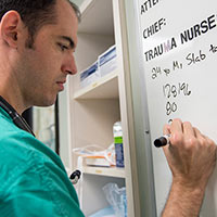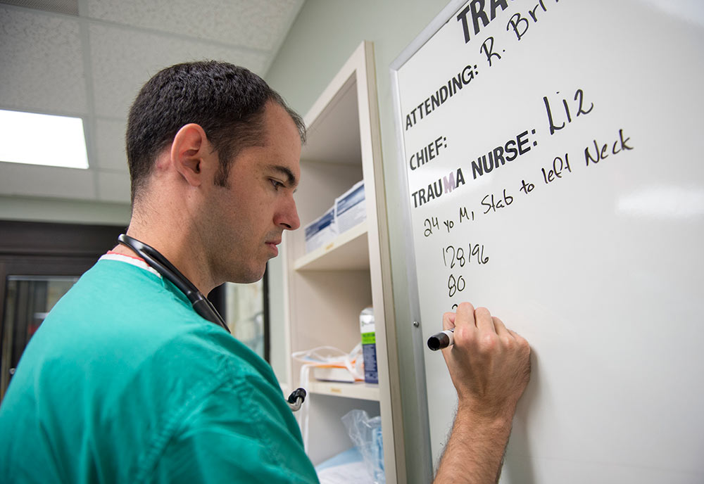 After speaking by radio with an EMT, Brian Allen, MD, a third-year emergency medicine resident, records the critical information so his colleagues can prepare to treat the stabbing victim.