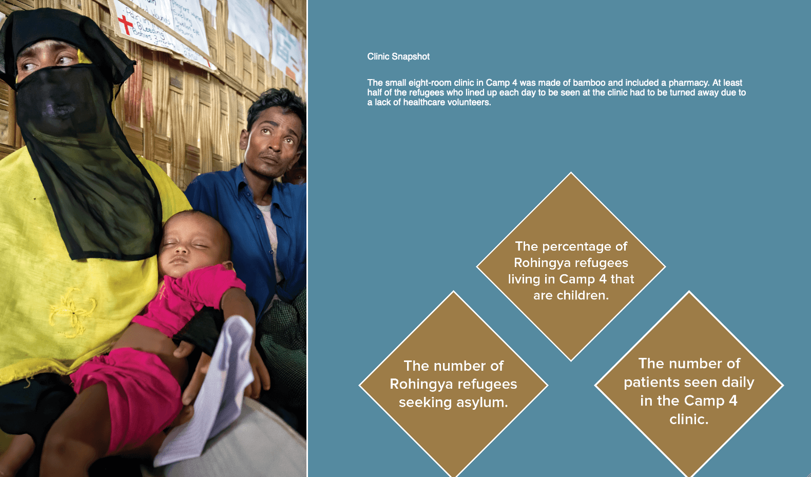 The small eight-room clinic in Camp 4 was made of bamboo and included a pharmacy. At least half of the refugees who lined up each day to be seen at the clinic had to be turned away due to a lack of healthcare volunteers.