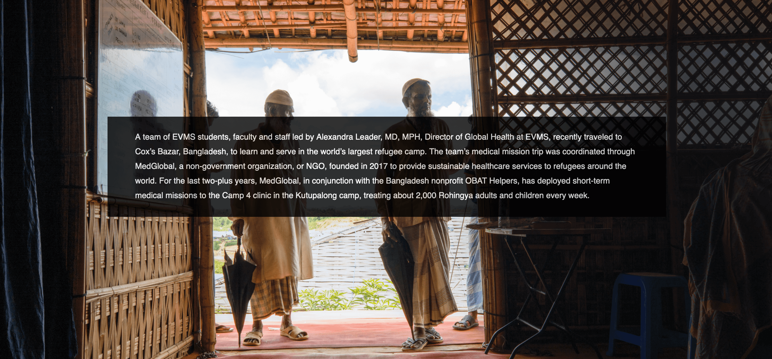 A team of EVMS students, faculty and staff led by Alexandra Leader, MD, MPH, Director of Global Health at EVMS, recently traveled to Cox’s Bazar, Bangladesh, to learn and serve in the world’s largest refugee camp. The team’s medical mission trip was coordinated through MedGlobal, a non-governmental organization, or NGO, founded in 2017 to provide sustainable healthcare services to refugees around the world. For the last two-plus years, MedGlobal, in conjunction with the Bangladesh nonprofit OBAT Helpers, has deployed short-term medical missions to the Camp 4 clinic in the Kutupalong camp, treating about 2,000 Rohingya adults and children every week.