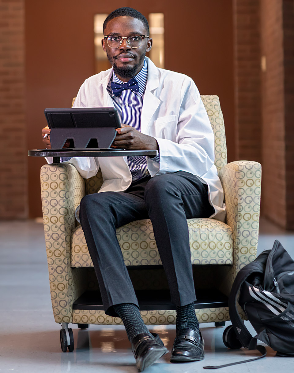 OLUWATOBI AKANDE, MD CLASS OF 2024, always had a passion for helping people. He often volunteered in medical clinics and homeless shelters, but his experience shadowing a doctor in a hospital emergency department made him realize he wanted to be a physician.