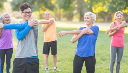 Good description: A fitness group of five people stretch their arms together while smiling and laughing on the lawn of a park.