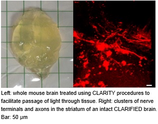 To evaluate the role of synaptic mechanisms in learning and memory we have adopted/developed behavioral techniques and collaborated with Dr. Sanford’s sleep laboratory to assess the connection of these mechanisms to sleep. We have also successfully collaborated with Dr. Britten’s lab to evaluate radiation induced changes in neurotransmission and cognitive performance. Recent additions to our technical arsenal are the CLARITY technique (see image), allowing the imaging of intact brains, and optogenetics, that facilitates functional and microscopic mapping of neuronal networks.
