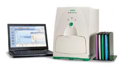 This instrument quantitates nucleic acid or protein in samples of 1.5-2 ul with the capability of measuring up to eight samples simultaneously. Sample quality data is the same as the Nanodrop 1000. When using an eight-channel pipette to dispense samples, 96 samples can be measured in less than six minutes.