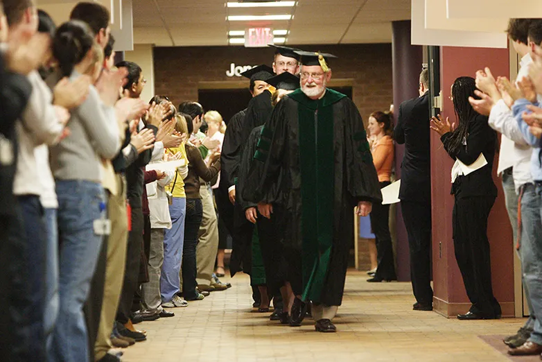 A cardiologist, Dr. Propert joined the EVMS faculty in 1981 as Associate Dean for Medical Affairs. In 1992 he moved to the VA Medical Center in Hampton as Chief of the Medical Service, while continuing to teach at EVMS. He retired from the practice of medicine in 2004, but continued to teach until 2014. (Pictured above, Dr. Propert leads an academic procession as one of the faculty marshals.)